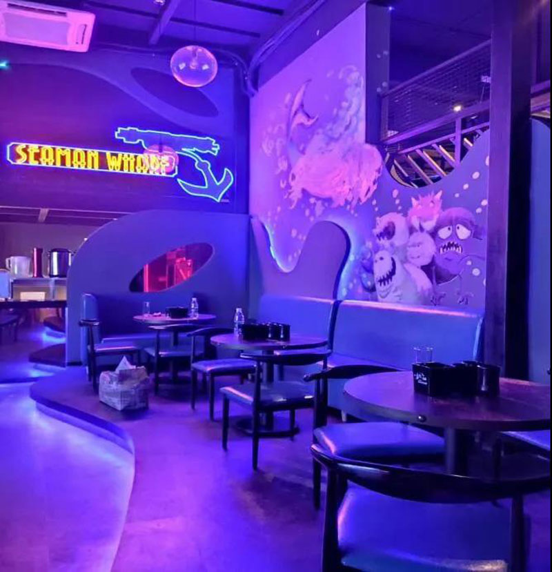 設(shè)計理念:從藍(lán)鯨這一主題出發(fā),凸顯氣質(zhì)灰,營造適宜搖滾、電音愛好者的暢玩、暢飲環(huán)境材質(zhì)方面較水泥漆(指批刮工藝)成本低。
