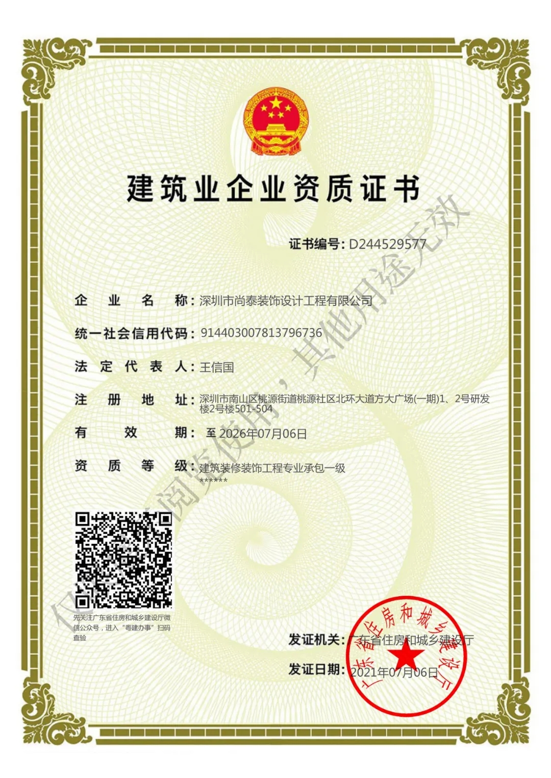 經(jīng)廣東省住房和城鄉(xiāng)建設(shè)廳審核批準(zhǔn), 深圳市尚泰裝飾設(shè)計工程有限公司于2021年7月6日獲得建筑裝修裝飾工程專業(yè)承包一級資質(zhì)。該資質(zhì)的取得,標(biāo)志著尚泰裝飾在人才規(guī)模、工程施工、項目業(yè)績、技術(shù)標(biāo)準(zhǔn)、管理水平等關(guān)鍵指標(biāo)上達到了較高標(biāo)準(zhǔn),將進一步提升公司的市場競爭力,為公司拓寬業(yè)務(wù)范圍、擴大經(jīng)營規(guī)模創(chuàng)造了有利條件,也標(biāo)志著公司綜合實力獲得肯定,為建筑裝修裝飾行業(yè)的發(fā)展和轉(zhuǎn)型升級貢獻力量!