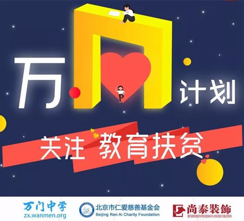 2017年12月11號(hào),萬(wàn)門(mén)發(fā)起 #萬(wàn)?計(jì)劃# 活動(dòng),尚泰裝飾與萬(wàn)門(mén)大學(xué)等100多家企業(yè)、機(jī)構(gòu)和組織參與了這次活動(dòng),一起攜手助力農(nóng)村教育扶貧,匯聚n種微小力量為農(nóng)村中學(xué)捐贈(zèng)優(yōu)質(zhì)在線課程,致力于降低農(nóng)村教育的門(mén)檻。