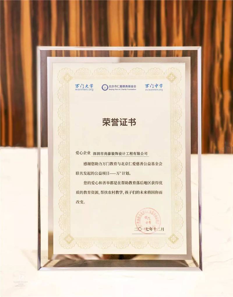 將萬(wàn)里挑一的愛(ài)心凝聚在一起,孩子們的未來(lái)因行動(dòng)而改變!活動(dòng)結(jié)束后,萬(wàn)門(mén)教育聯(lián)合北京市仁愛(ài)慈善基金會(huì)為尚泰裝飾授予愛(ài)心企業(yè)榮譽(yù)證書(shū)。