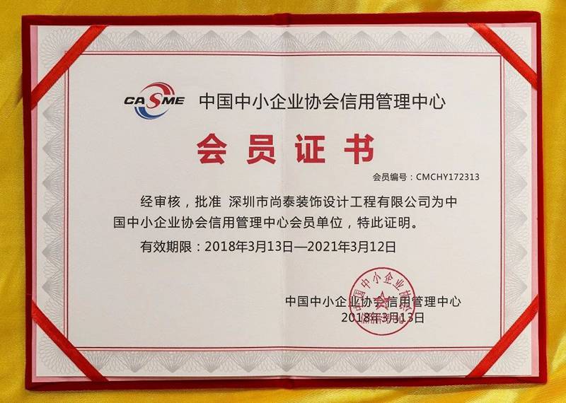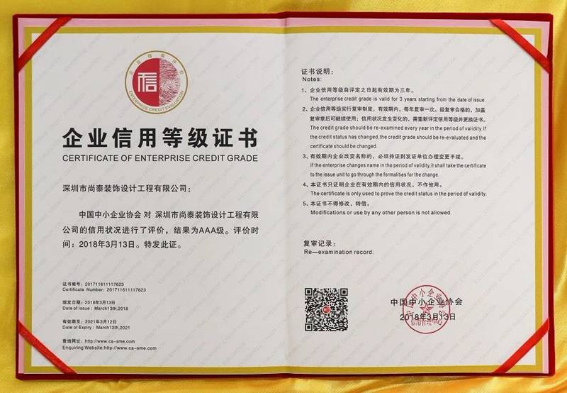 2018年3月13日,中國中小企業(yè)協(xié)會為深圳市尚泰裝飾設(shè)計工程有限公司頒發(fā)了企業(yè)信用等級證書,對深圳市尚泰裝飾設(shè)計工程有限公司的信用狀況進(jìn)行了評價,結(jié)果為AAA級,證書編號:201711611117623。同時,中國中小企業(yè)協(xié)會信用管理中心批準(zhǔn)深圳市尚泰裝飾設(shè)計工程有限公司為中國中小企業(yè)協(xié)會信用管理中心會員單位。