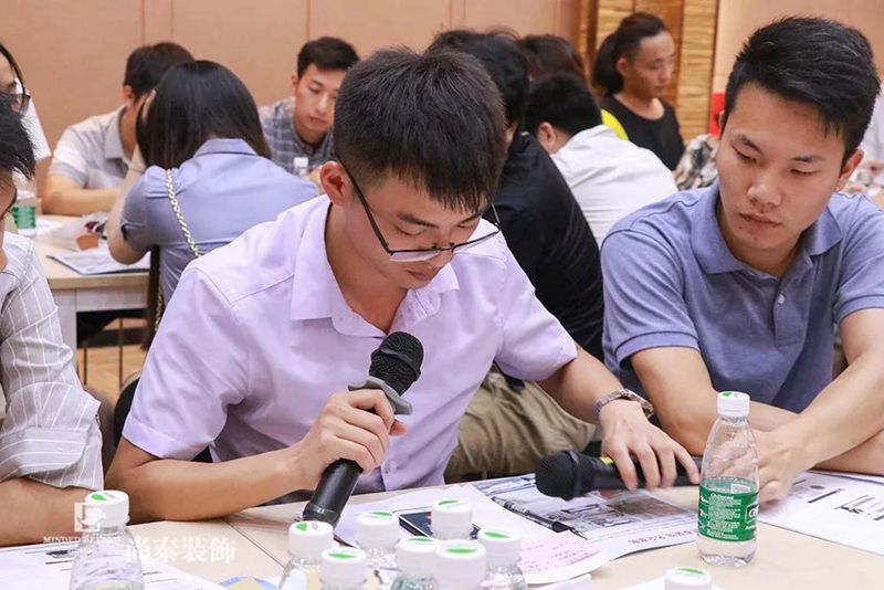 第一天的課程高潮迭起,尤其是在實景模擬第一次與“客戶”電話邀約環(huán)節(jié),每一組代表設計師都要在“眾目睽睽”之下?lián)芡ā翱蛻簟彪娫?,了解“客戶”需求,想方設法獲得更多的“客戶”信息,邀約“客戶”見面,化解“客戶”的種種“刁難”,并且“客戶”會一直“陪伴”到整個培訓課程結束,親臨現(xiàn)場聽取設計師的最終“方案匯報”,通過最接近真實的模擬演練,真正達到培養(yǎng)設計師營銷能力與設計能力的高強度學習效果!