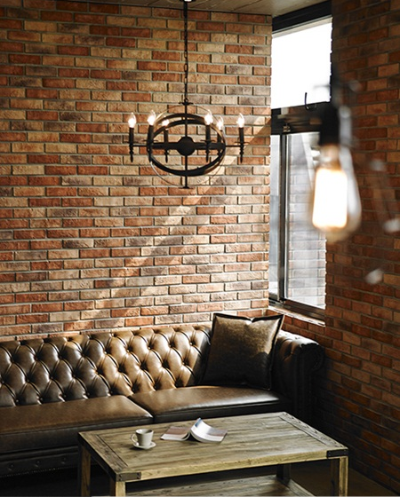▲仿古沙發(fā)、吊燈與磚墻、木桌完美融合,營造出復(fù)古典雅氛圍