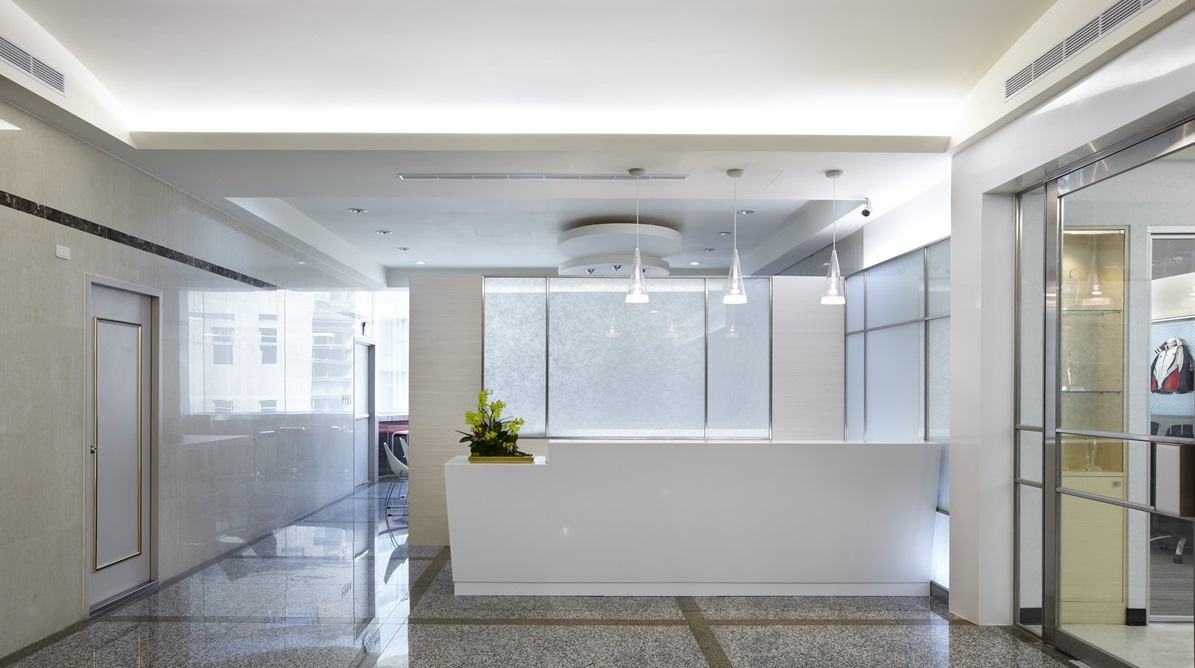 在迎賓大廳內(nèi),采霧面材質(zhì)做為四周墻面,并以亮面大理石鋪陳地坪,展現(xiàn)大器簡約感,將大量純白色作為空間主調(diào),給人清爽舒適的體驗,同時巧妙配置兩張色彩鮮明的沙發(fā),讓跳躍色彩增添視覺活潑度,藍(lán)色招牌則使用壓克力雕刻,并配置超薄 LED 燈,營造出反射的立體效果,加深品牌印象;會議室采用清玻璃門片,維持整體空間的通透感,使開會氣氛透明且公開,并在會議室兩側(cè)墻面注入展示機能,用來放置公司商品,在整齊的陳列之下,給人一目了然的感受!