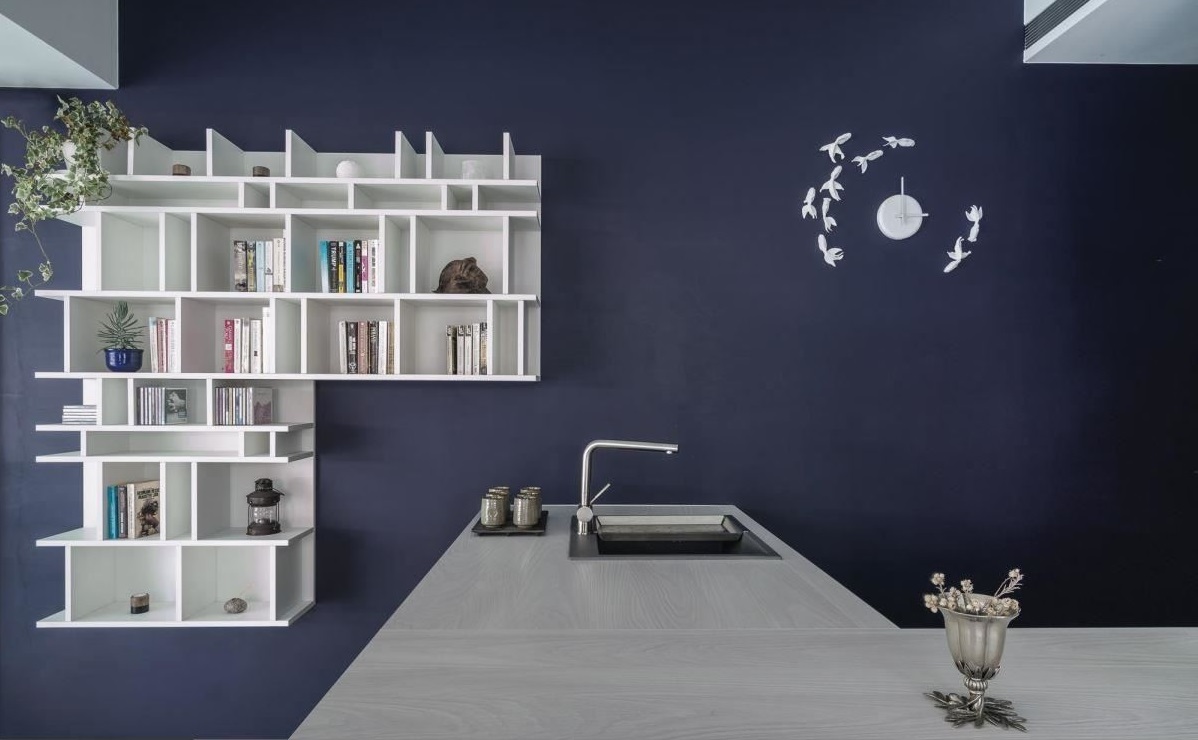 清新的白色天花板與柜體,與深藍(lán)墻面搭配出優(yōu)閑的生活感。