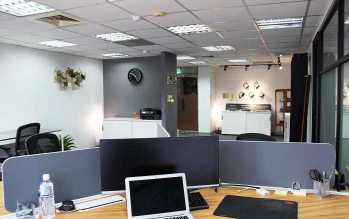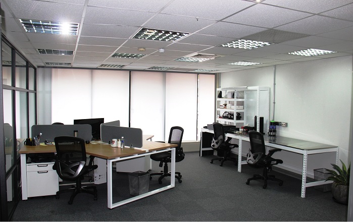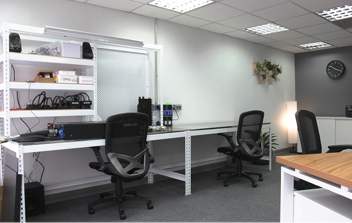 傳統(tǒng)的OA辦公家具的外觀都比較呆板,格屏的高度也較高容易遮蔽視線。業(yè)主希望讓辦公環(huán)境看起來活潑,所以選用新式的三人工作站,工作桌面成圓形排列但使用面積不變,有效利用室內(nèi)空間。另外降低隔屏高度,同事間溝通更容易。主要辦公區(qū)域采用開放式的配置,在辦公區(qū)旁的是簡(jiǎn)易維修區(qū),負(fù)責(zé)不同工作的兩組人可立即地互動(dòng)討論。