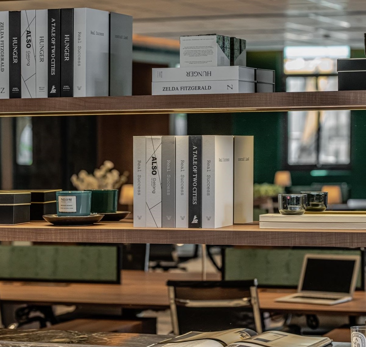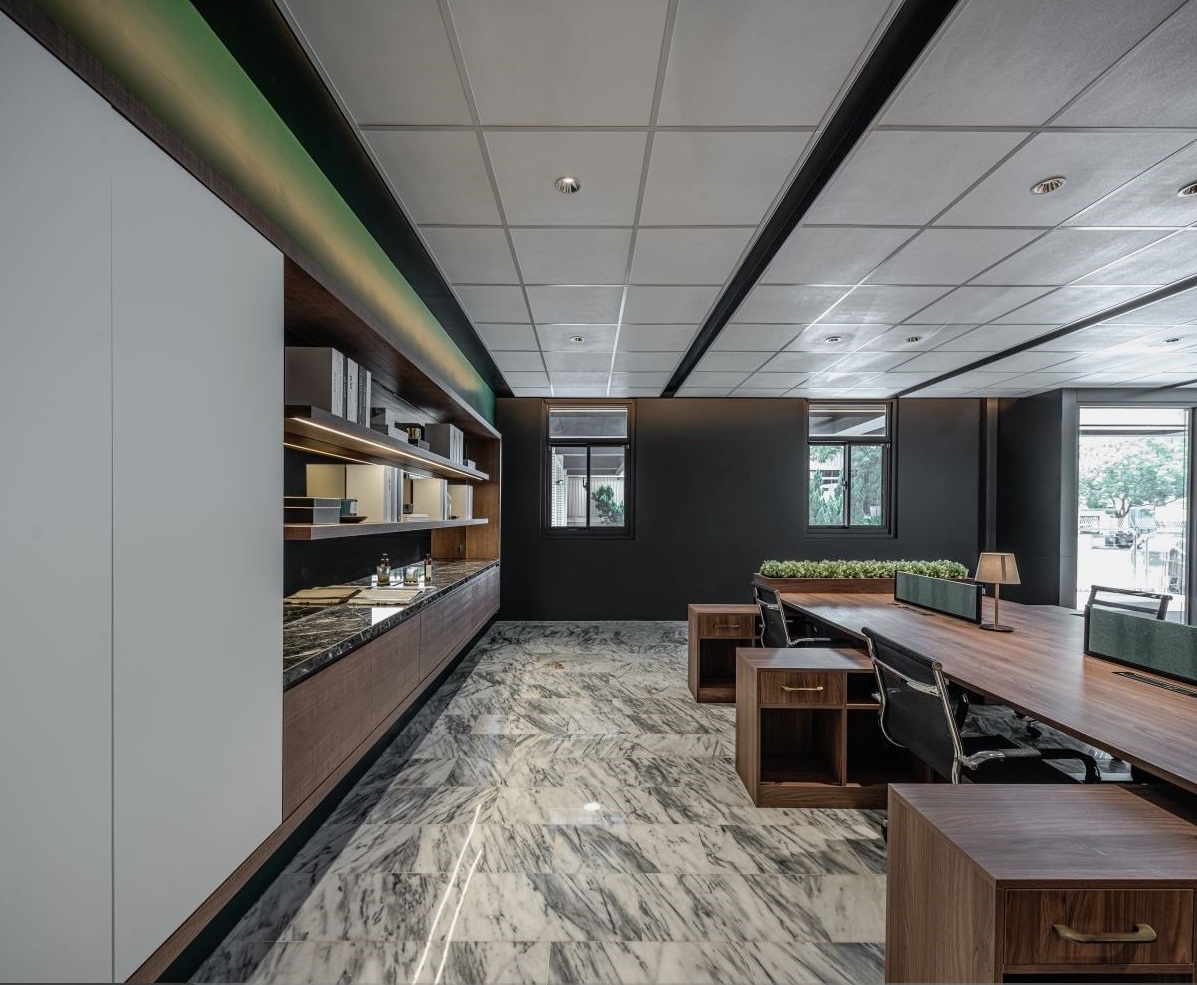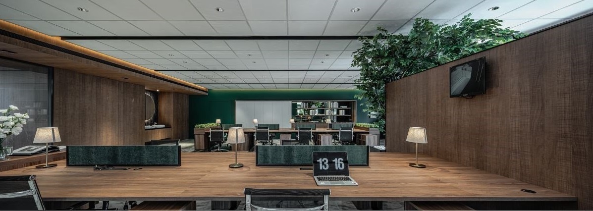 室內(nèi)透過沉穩(wěn)的木質(zhì)主調(diào),打破一般辦公室給人的冷冽呆板印象,再佐以復(fù)古綠的大面積妝點(diǎn),讓人有種歐洲百年飯店大廳的既視感,襯托出該企業(yè)的經(jīng)驗(yàn)厚度與雋永內(nèi)涵。此外,設(shè)計(jì)師還刻意保留白色大理石紋地坪,在結(jié)合木質(zhì)與石紋等建材之后,表現(xiàn)出新舊交織的和諧視覺,并讓自然和人文在空間中優(yōu)雅共舞。