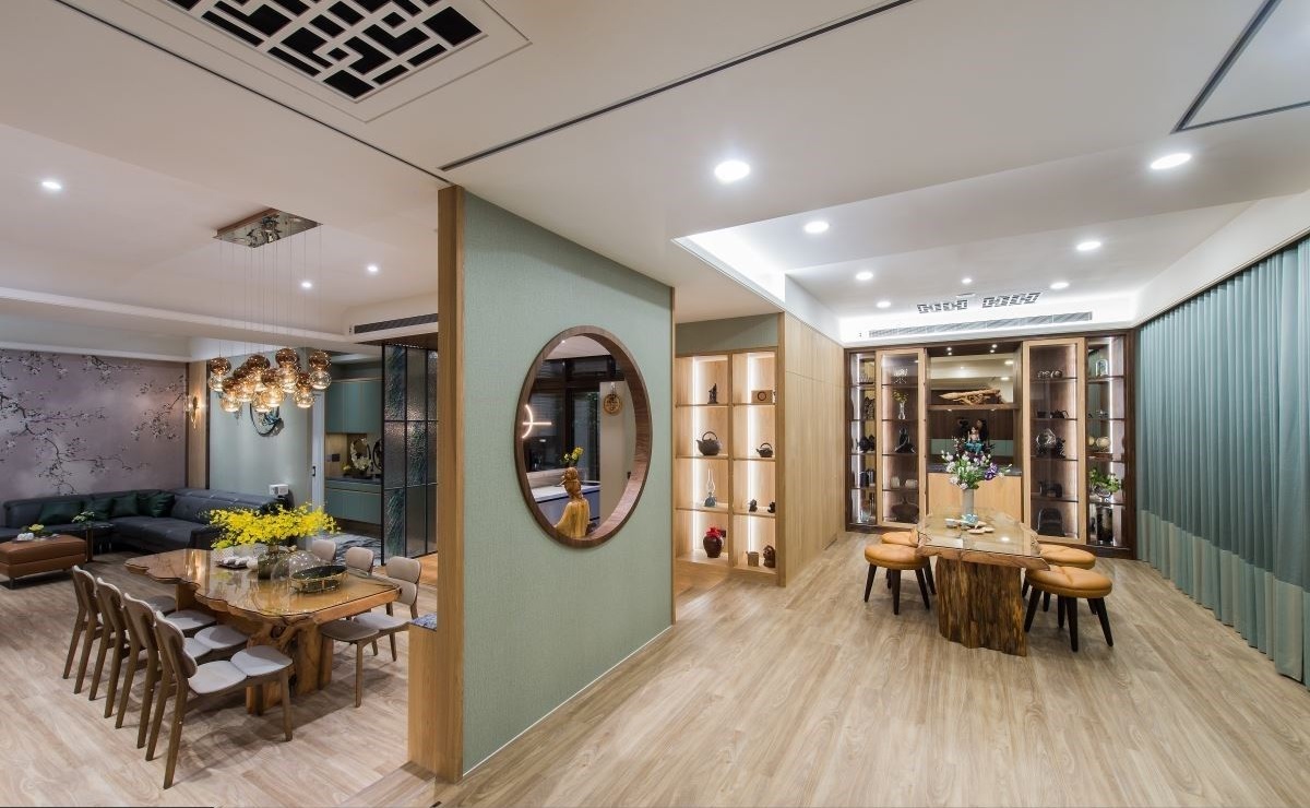 60坪的空間里,為了打造屋主期待結(jié)合辦公室與招待所的需求,尚泰裝飾的設(shè)計(jì)師屋主喜愛的新古典元素為基底,并融入男屋主收藏的檜木藝術(shù),透過異材質(zhì)創(chuàng)意巧思,混搭出充滿東風(fēng)禪意與華麗古典的新穎美學(xué)。