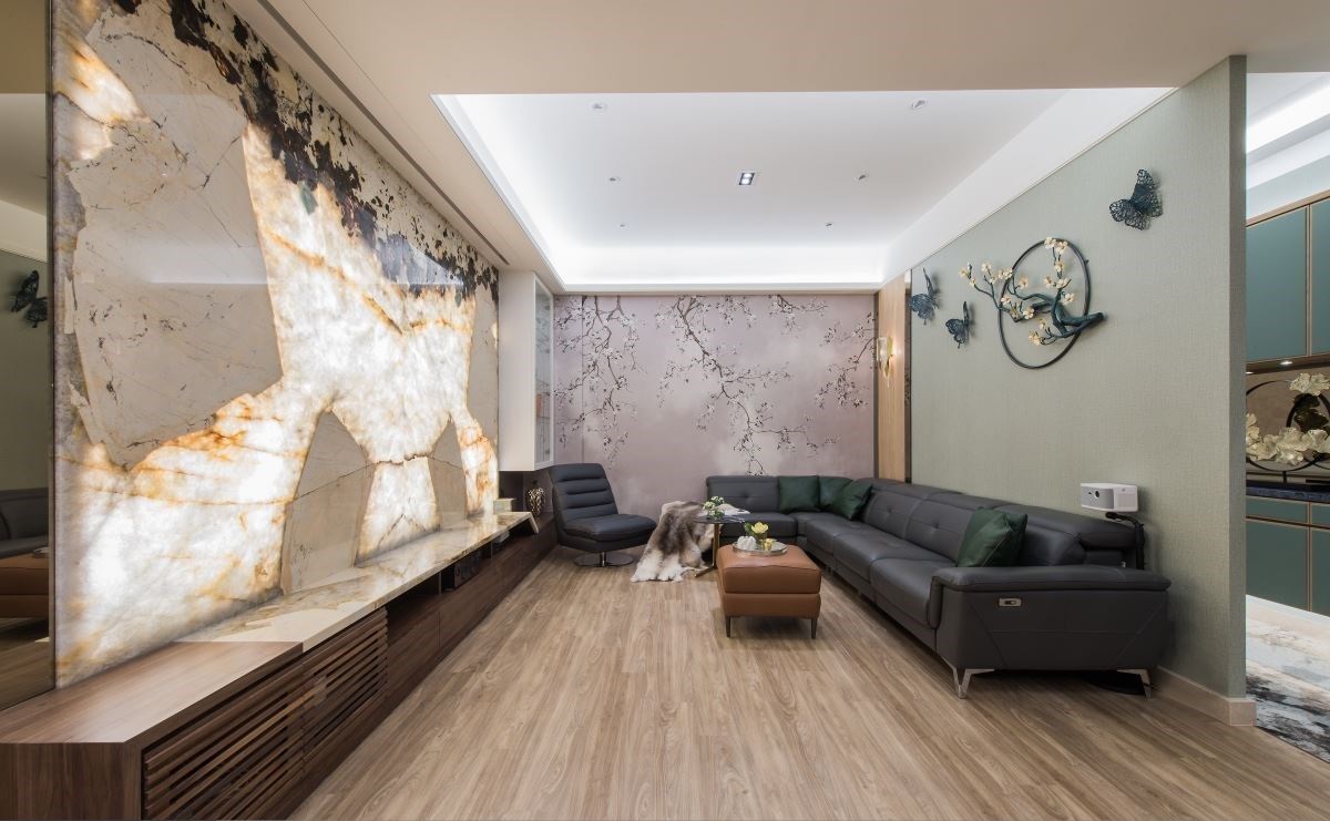 玄關(guān)鋪陳雪山藍(lán)大理石地坪,與一旁運(yùn)用青花瓷打造的大理石臺(tái)面與藝術(shù)品陳列,交織出雅致非凡的迎賓風(fēng)尚;以窯燒玻璃與鐵件搭建一道頂天的屏風(fēng),穿透的肌理讓光線可自在流淌一室,且結(jié)合180度旋轉(zhuǎn)的活動(dòng)設(shè)計(jì),可依需求調(diào)整立面位子,達(dá)到避開風(fēng)水禁忌的疑慮。電視墻以絕美石材打造,鮮明的獨(dú)特肌理與色澤,搭配兩面背墻分別以枝葉花卉壁紙,與蝴蝶裝置藝術(shù)的自然語匯,特調(diào)出無限自然生命力。