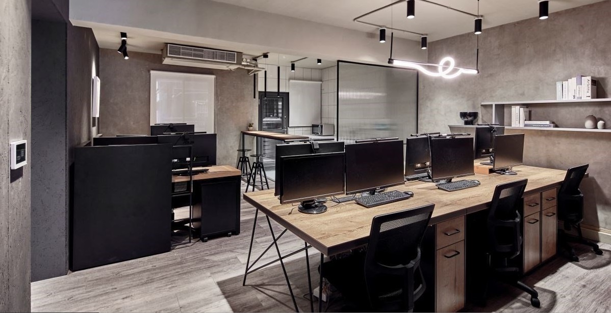 跳脫商業(yè)空間的思維,以個性工業(yè)風作為基底,辦公桌以木桌搭黑鐵腳設計,系統(tǒng)板材打造個人抽屜柜;開放式的桌面像是咖啡廳里面的大長桌,可以專注工作也方便與同事相互討論交流。茶水間植入高腳吧臺座位,半透明的長虹玻璃隔屏帶給休憩區(qū)隱私,同時又不會生硬地切割空間;冰冷的天花板照明改成軌道燈,偏暖的色溫搭配可以調(diào)整照明角度的設計,會讓空間多幾分溫暖,同時也能打在墻面創(chuàng)造光影的變化趣味。廊道上與空間轉角擺放著色彩繽紛的藝術掛畫以及公仔玩偶,每個轉角都帶著驚喜,也能激發(fā)活力與創(chuàng)意;而戶外陽臺擺放張椅凳搭配大型落地植物,創(chuàng)造一個自然充電的角落。