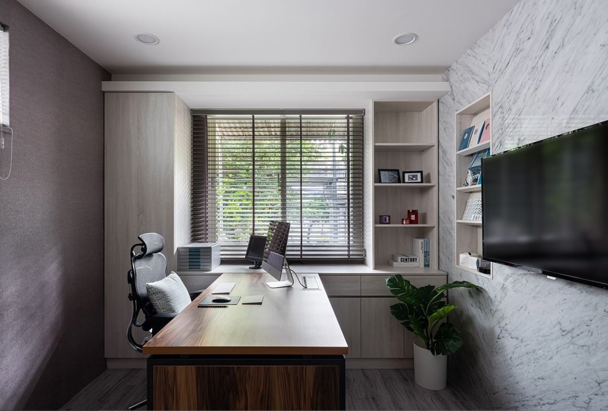 主管室加裝百葉窗,讓屋主能自行調(diào)整光線,同時享有隱私,而大理石電視墻除了提升尊榮感以外,還融入壁龕收納設(shè)計,彰顯屋主的藏書品味。