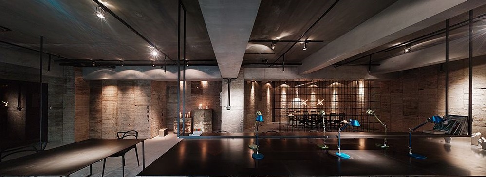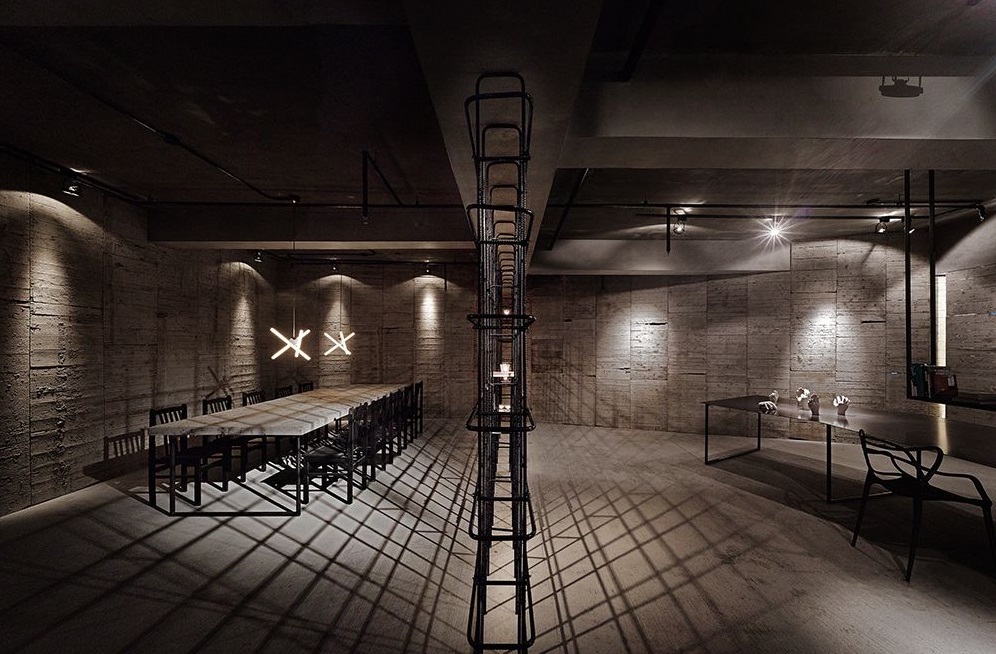 設(shè)計(jì)師利用板膜形塑辦公空間的基底,板模,是每棟建筑墻面在水泥未粉光之前的樣貌,粗獷且非秩序性,空間中則以交織的鐵件作為場(chǎng)域界定,最后再融入富于劇場(chǎng)張力的燈光計(jì)畫,板膜被不同的燈光刻劃出迥異的形貌,鐵件被燈光照射后倒映在地面、桌上的光影變化讓原本單調(diào)的辦公空間像攝影棚或舞臺(tái),隨著軟硬體改變而多采多姿,而人員在其中的活動(dòng)更有如登臺(tái)演出成為空間的一幕。