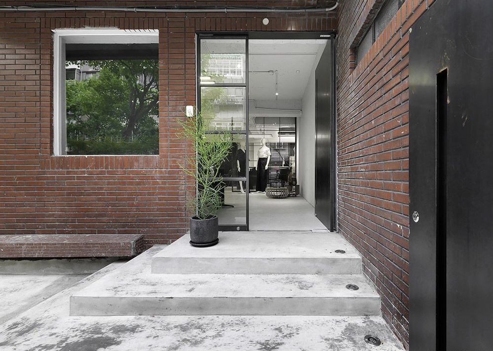 在建筑外觀上選擇保留老房子外墻,借由其內(nèi)斂質(zhì)地以及簡化設(shè)計的外窗來與追求極致的品牌精神作融合,同時將建筑外部景觀整合,透過階梯設(shè)計提供戶外座區(qū)與極簡意象。