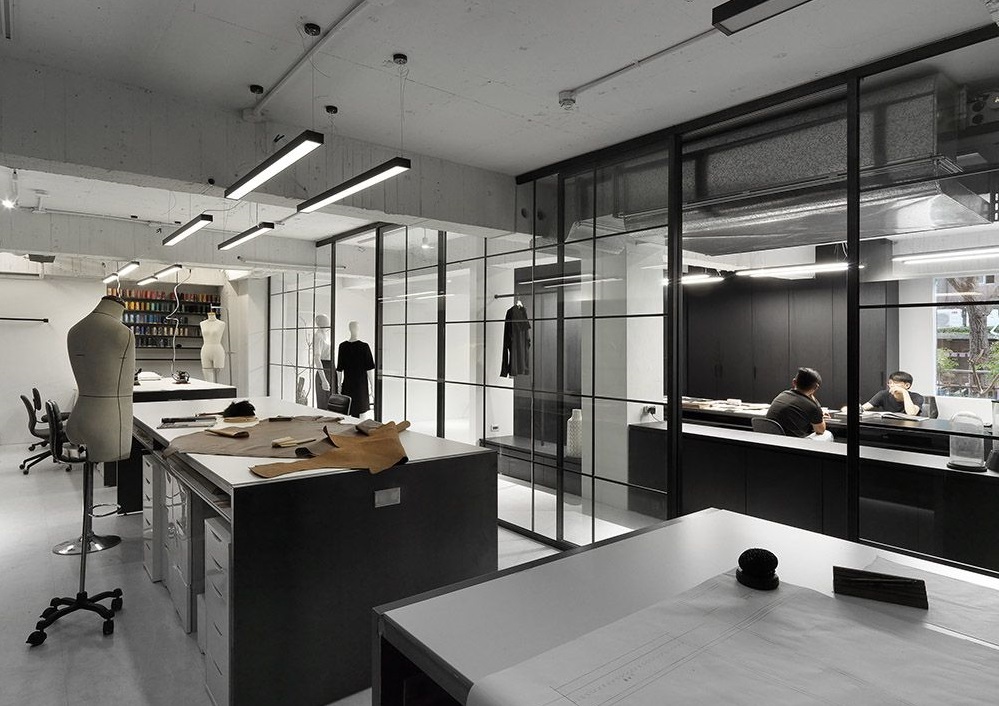 與辦公區(qū)以柱體與鐵件玻璃墻相隔的后方為縫制后區(qū),打版、剪裁、縫紉都在這里,此區(qū)透過縮短工作動線距離讓流程更順暢。另外,通道也可作為服裝動態(tài)拍攝的場景。