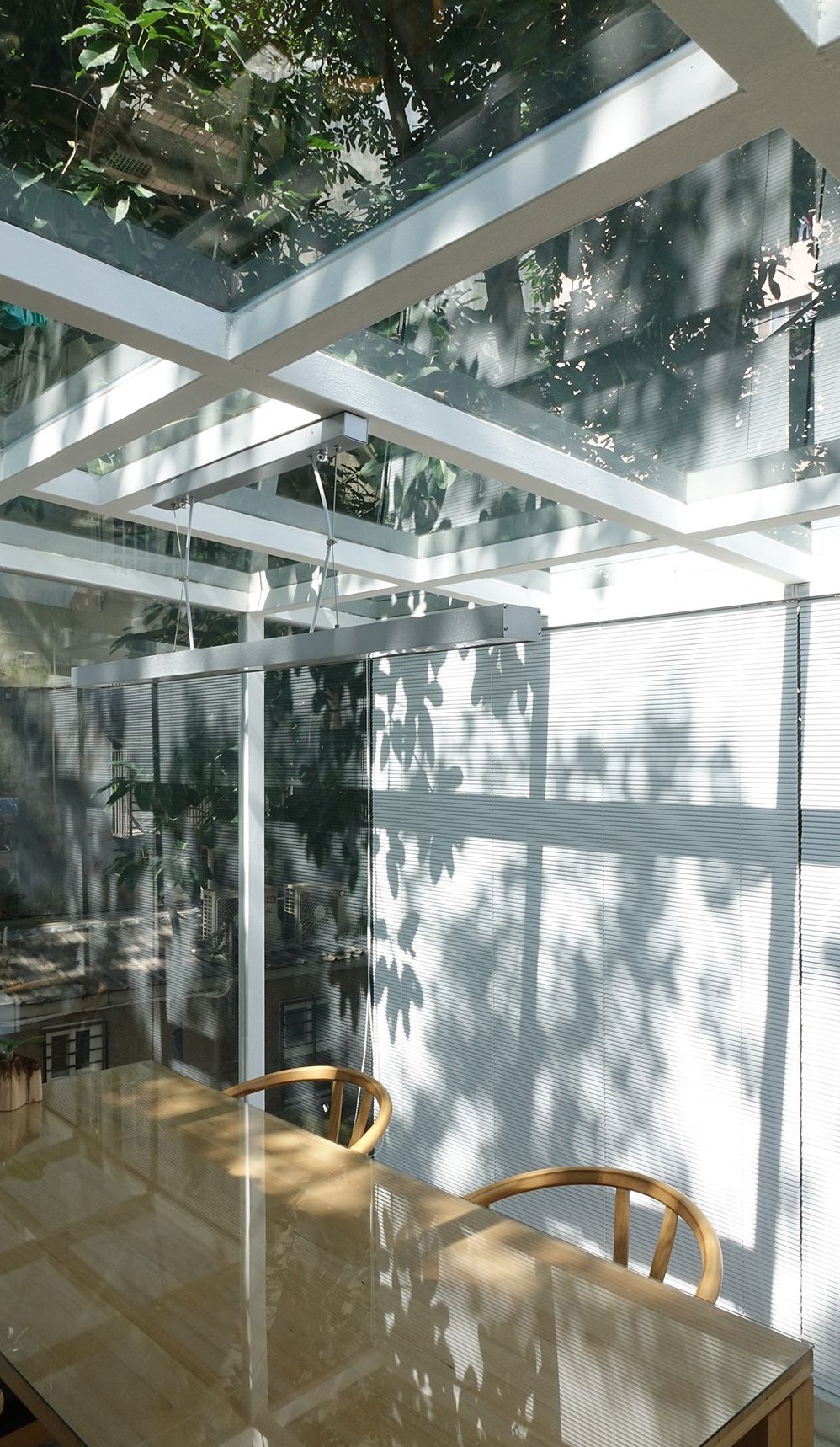 以全玻璃隔間呈現(xiàn)出充滿光影與自然氣息的會(huì)議室,為引光入室,與室內(nèi)的隔間也采用玻璃拉門,將大自然與室內(nèi)空間完美接軌。為保持視覺(jué)寬闊感,設(shè)計(jì)師將位于角落兩邊的支撐框架向后移,不讓框架阻斷視覺(jué)效果。