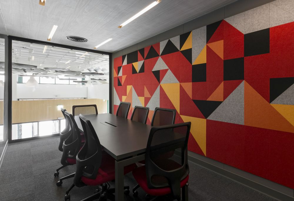 貨柜富有傳遞意義,與歐銻銻娛樂公司的精神有相呼應(yīng)的意味,因此沈總監(jiān)以貨柜屋做為會議室的模型。7間會議室以不同的顏色代表,并利用星期命名,成為空間的一大亮點。裝置大片落地窗的會議室依然注重隱密性,因此每間會議室的背墻都是以吸音板拼接而成,地板夾板中也加入保麗龍,大幅降低聲音外露的可能性。