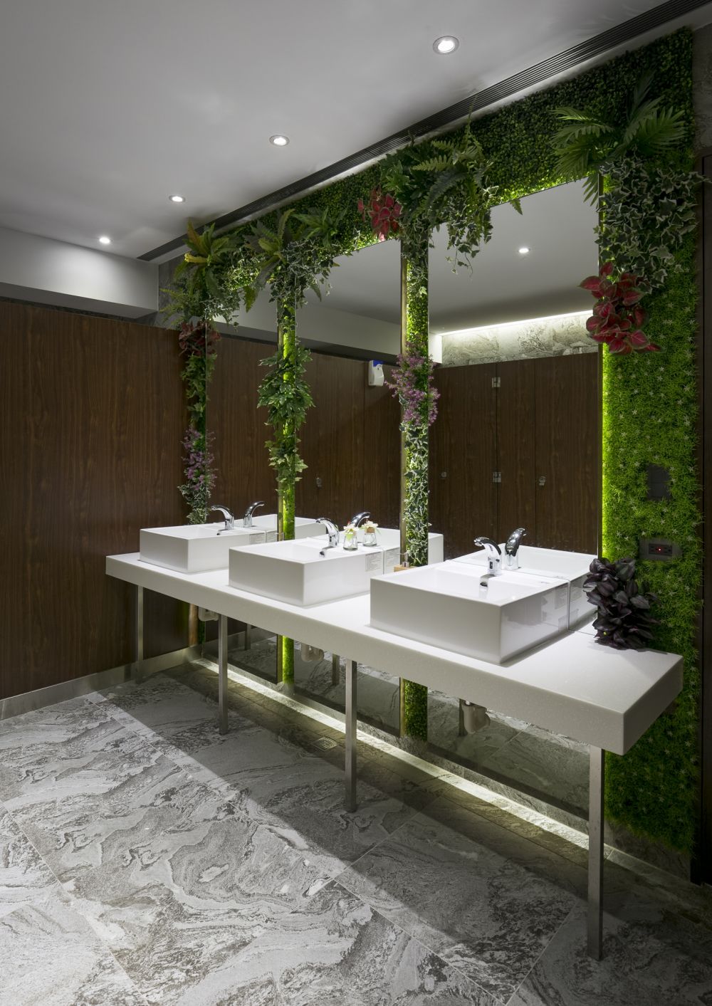 利用較耐陰的植物做成植栽墻,讓使用者有仿佛進(jìn)入森林之感,使廁所都別致精美,植栽墻除了增加景色外還有吸附異味的用處,讓廁所時時保持清香。