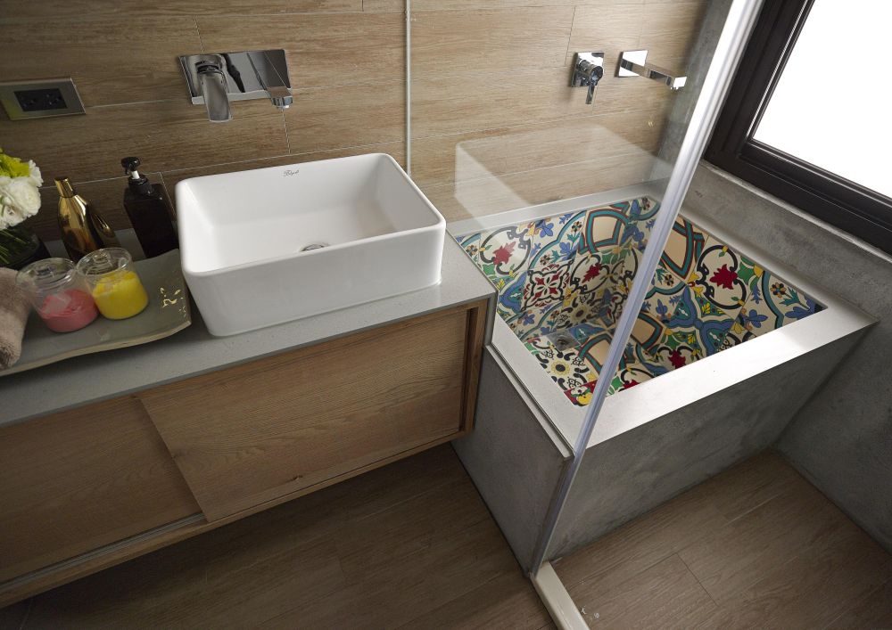 室內(nèi)僅有一間的衛(wèi)浴為了讓在不打擾員工工作的情況下也能輕松使用,在動(dòng)線上也特別思量,而浴缸內(nèi)色彩鮮艷的瓷磚則呼應(yīng)歐洲古典風(fēng)格。