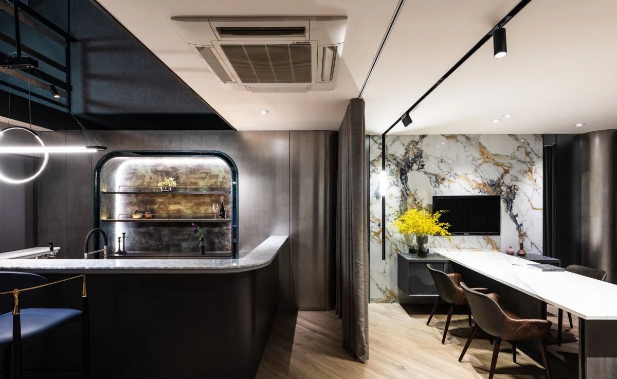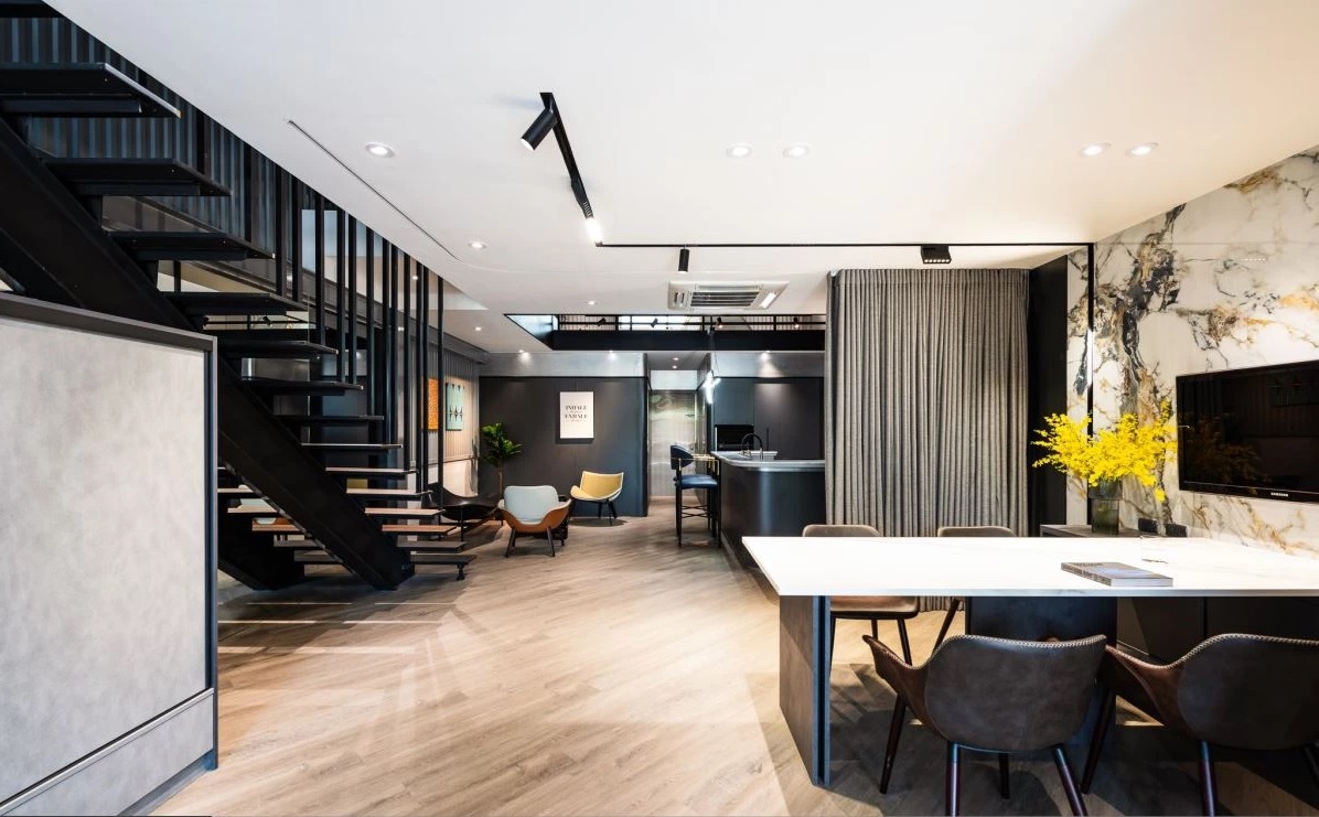 進入辦公室沒有制式的柜臺,而是會客桌和展示區(qū),利用高挑的空間,安排前衛(wèi)的橢圓造型吊燈,充滿氣勢和意象。兩旁是廚具和衣柜等展示區(qū),考量到之后可能改變商品陳設,墻面盡量以素面灰色調為主。中間天花較低的過渡區(qū),作為內部開會區(qū)域,以大理石花紋美耐板位會議區(qū)鋪陳質感。吧臺區(qū)運用復古元素和現(xiàn)代設計語匯,深綠色的美耐板帶出英式韻味。二樓是辦公區(qū),安排玻璃圍欄,遠看辦公區(qū)好像懸浮在空間中,既呼應主題,也有放大空間視覺感的效果。