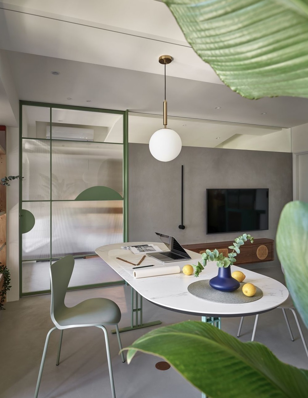 以墨綠作為空間主色,呼應(yīng)了窗外景色的綠意盎然,一般人的家鮮少會(huì)選用大膽的顏色,但因?yàn)檫@不僅是住宅,也是工作室,設(shè)計(jì)師希望能借此定位出鮮明的風(fēng)格,給來(lái)訪的客戶帶來(lái)深刻的印象。而為了展現(xiàn)出童趣,以亮眼的粉紅色沙發(fā)來(lái)做搭配,再選用灰色地板,平衡視覺(jué)感受。