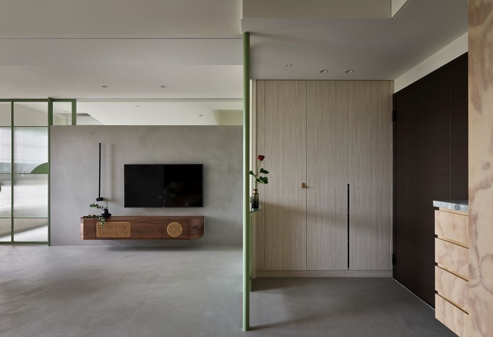 為避免開(kāi)門見(jiàn)內(nèi),玄關(guān)處規(guī)劃了一座玻璃屏風(fēng),并刻意導(dǎo)了圓弧角,柔和視覺(jué)外,也讓空間多了獨(dú)特性。而除了屏風(fēng)之外,墨綠色主墻、訂制的工作桌、主臥的鐵件拉門,也都是延續(xù)圓弧曲面的有趣元素。