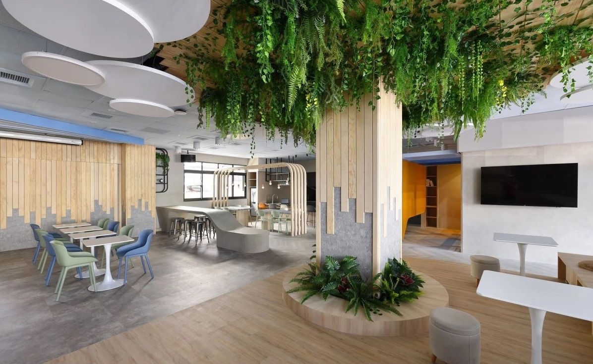 這間改造的600平商業(yè)辦公室空間,是致力于發(fā)展太陽能源的——能源類的有限公司。因應永續(xù)利用的綠能精神,全室選用大面積的淺木質調,搭佐天然石材及綠意植栽,詮釋身處大自然的放松氣息,而格局規(guī)劃上,跳脫制式的辦公室設定,以開放式手法,編排不同型態(tài)的工作環(huán)境,并融合攀巖抱石、攀爬網,打造能拋開緊繃情緒的工作場域。