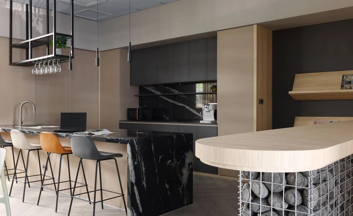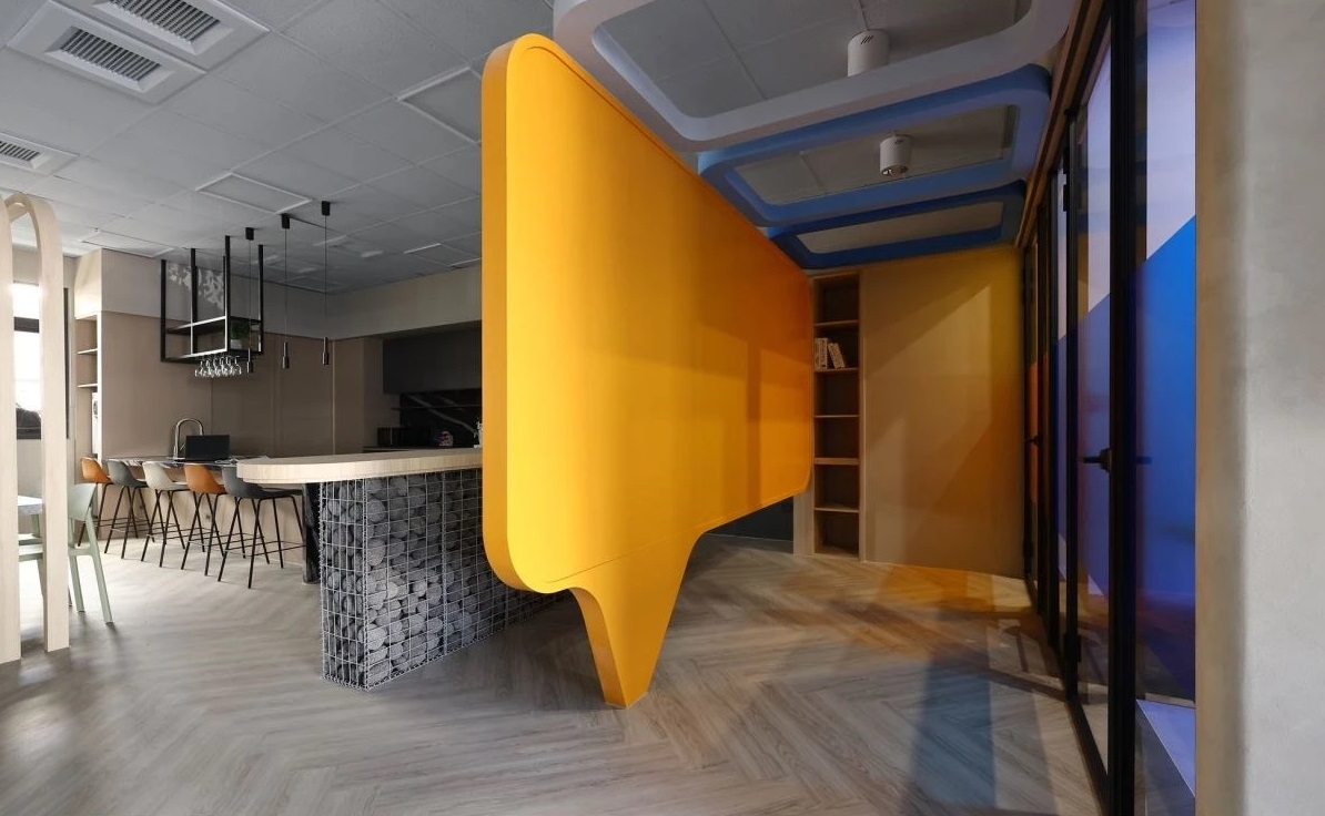 入口處坐落鮮明的亮橘對話框,給人耳目一新的朝氣活力,更強調人與人之間溝通的重要性,并在背面安排白板設計,加上由石塊奠基而成的簡報臺,順勢建立起小型的會議室。輕食吧臺區(qū),注入靜謐的深黑大理石,輔以俐落的鐵件吊架、收納柜,配置流理臺及烹飪小家電,讓員工能滿足午間的料理需求,平日也是彈性寫意的辦公區(qū),隨時切換截然不同的工作心情。