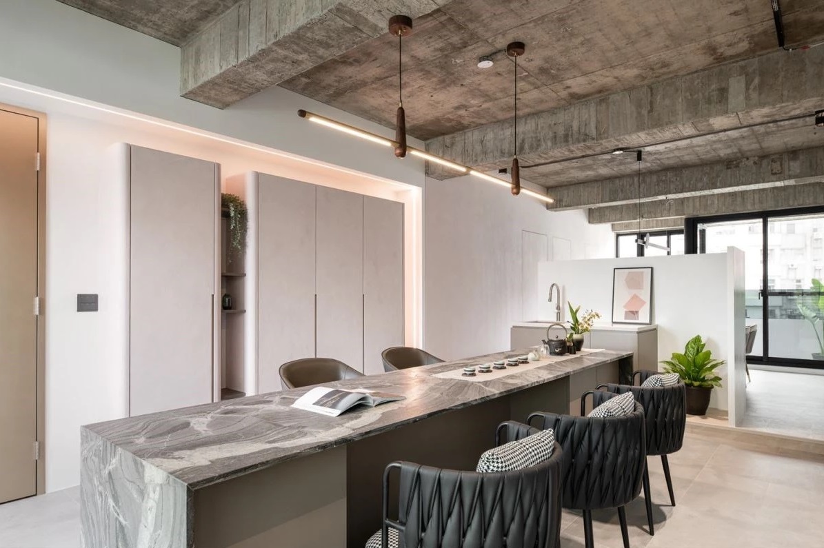 32 年老房子改造案中,首先處理漏水壁癌等問題、并加強(qiáng)防水后,重新梳理空間動(dòng)線,利用兩張大辦公桌和一張長型大理石桌,天花板局部模板與包梁設(shè)計(jì),在開放空間畫分出待客區(qū)與辦公區(qū),同時(shí)也創(chuàng)造寬敞的行徑動(dòng)線。 在商業(yè)空間中以長型大理石長桌搭配中島取代傳統(tǒng)的會議桌,梁柱旁懸空收納柜消弭突兀梁柱,亦可擺放會議所需要的型錄與資料,柜體使用礦物涂料營造質(zhì)樸質(zhì)感;中島茶水區(qū)設(shè)計(jì)半高墻替會議區(qū)帶來更多隱私,面向會議區(qū)的矮墻可直接吊掛電視,雙面運(yùn)用發(fā)揮最大坪效。會議區(qū)再往內(nèi)推開玻璃拉門是總監(jiān)辦公室,造型門片結(jié)合長虹玻璃與藤編設(shè)計(jì),另一側(cè)墻面用玻璃磚引入辦公區(qū)光線;辦公區(qū)以大尺度辦公桌搭配異材質(zhì)系統(tǒng)柜,融合設(shè)計(jì)美學(xué)與實(shí)用機(jī)能。兩間衛(wèi)浴中,其中一間使用檜木屑條紙的沐薰漆,不只具備珪藻土調(diào)節(jié)濕氣的功能,還會散發(fā)淡淡的檜木香氣。