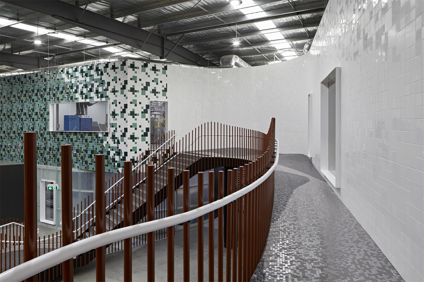 利用Hundertwasser的植被螺旋,景觀的精神–通過顏色和紋理來表達(dá)–被鼓勵(lì)從附近的本土保護(hù)區(qū)流入生產(chǎn)設(shè)施的內(nèi)部。這些元素在室內(nèi)起伏,為飾面和材料的選擇提供參考,甚至激發(fā)了自然起伏的地板。