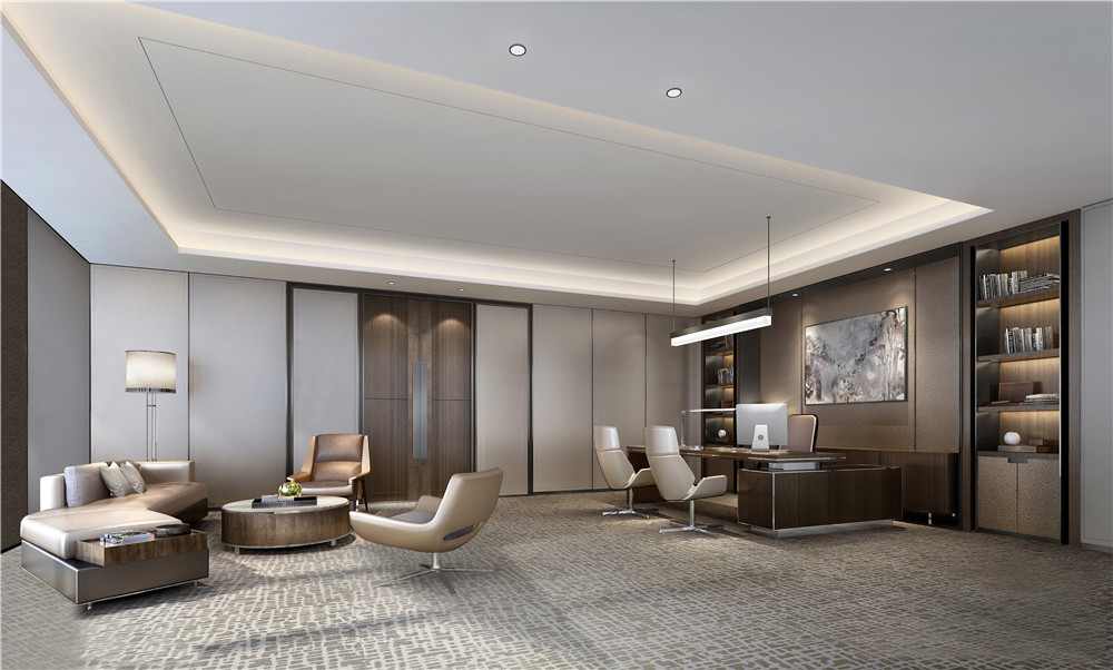 總經理辦公室裝修效果圖:大班臺凸顯了總經理的身份地位,接待、休息、洽談給人一種家的感覺,設計師希望為總經理帶來家的感受與溫暖,讓空間有了溫度。