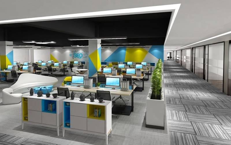 二樓空間職能上的巧妙轉換,開放辦公區(qū)文化墻通過黃,藍,灰,白等幾個大色塊的簡單劃分,營造活潑輕松的環(huán)境氛圍。利用書柜、休閑桌椅、綠植作為自然隔斷,降低小團隊之間工作的干擾,既保證員工之間的交流,也創(chuàng)造一定的工作保密隱私性。休閑桌椅與辦公區(qū)的穿插設計讓員工擁有片刻休憩的選擇,提高空間利用的可持續(xù)性,提高員工的工作效率。