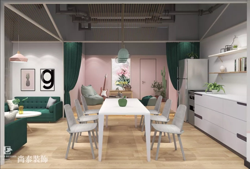 其中我們多采用幾何圖形和字幕組排的刷漆效果給原有單調(diào)乏味的墻面帶來新的活力。多開發(fā)新的員工休閑區(qū),也屬于網(wǎng)紅打卡區(qū),為員工的創(chuàng)作提供不同的靈感和想法,也提供了不同的休息空間放飛自我。主要色調(diào)為綠色和木色。網(wǎng)紅打卡區(qū)大膽采用豐富的顏色,為整個(gè)辦公空間帶來不同的風(fēng)景線。