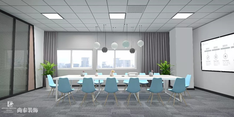 大會(huì)議室作為一個(gè)集中以及接待的區(qū)域,以藍(lán)色為主調(diào)色,在布置方面更為大氣,強(qiáng)調(diào)空間的儀式感。