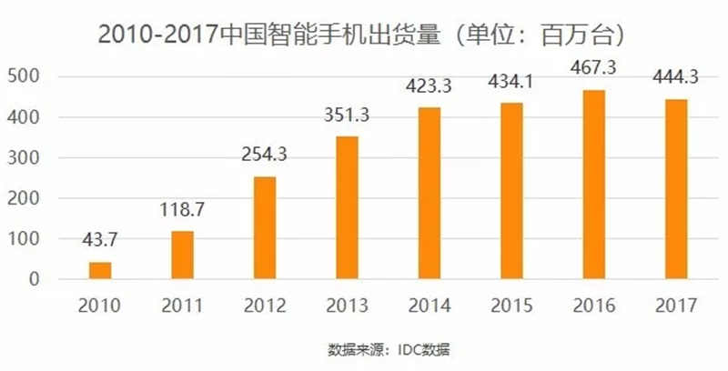 根據(jù)數(shù)據(jù)顯示,2016 年中國(guó)智能手機(jī)出貨量達(dá)到高峰共計(jì)出貨 4.673 億部,而 2017 年中國(guó)智能手機(jī)出貨量減少了將近 5%,出貨量為 4.443 億部。