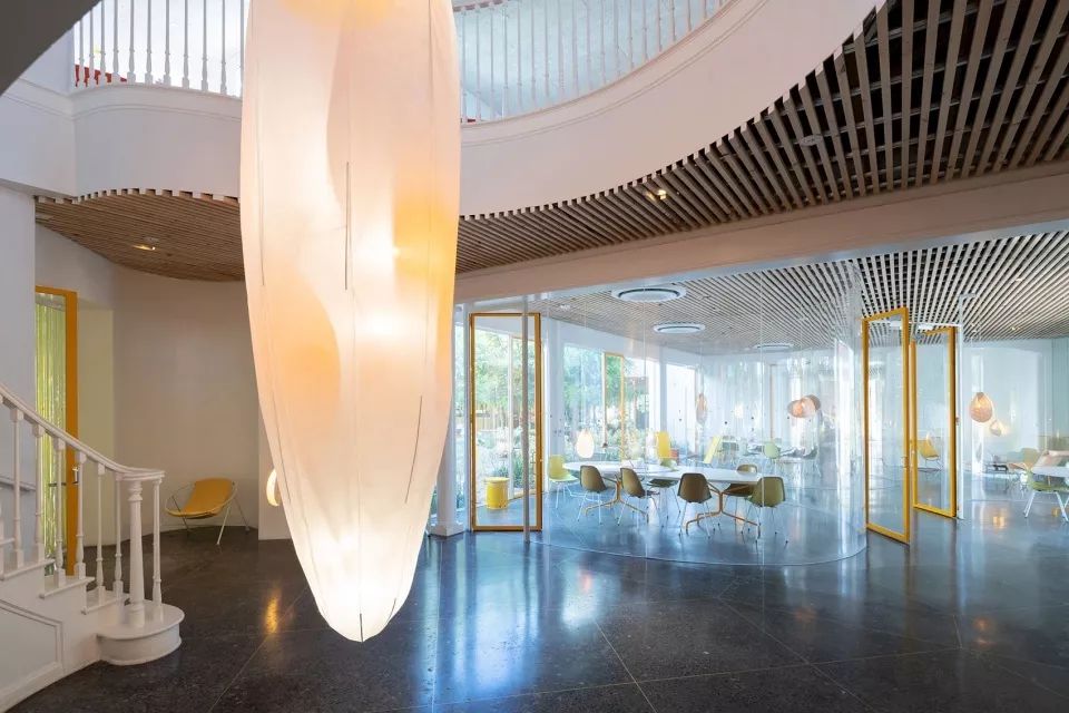 另外,園區(qū)里有60個黃色的大小不一的園亭,就像分裂的細胞一樣。亭內辦公桌的設置也和園亭的形狀一樣采用環(huán)繞曲線的方式,玻璃隔離可以使人很清楚地看到外面的綠植,人們在里面辦公不僅采光、視野很好,而且還心情愉悅。園亭之間設置有四通八達的小道,通道兩旁都是栽種的綠植,人們或在疏影下討論工作,或一個人沉思問題,真的就像是在公園里一樣。