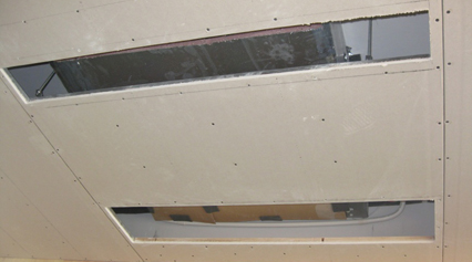 輕鋼龍骨軟墊連接防裂工藝:防止吊頂與墻體結(jié)合處開(kāi)裂 因石膏板與墻體材質(zhì)不同,吊頂、隔墻與原墻體結(jié)合處極易開(kāi)裂,尚 泰在兩者結(jié)合處的采取了專(zhuān)用軟墊片做過(guò)渡性柔性連接,以減緩不同 材質(zhì)因脹縮碰撞而引起的裂縫 | 空調(diào)風(fēng)口整板防裂工藝:防止中央空調(diào)出風(fēng)口開(kāi)裂 由于使用中頻繁的細(xì)微振動(dòng),吊頂?shù)闹醒肟照{(diào)出風(fēng)口處極易開(kāi)裂,尚 泰在風(fēng)口處采取了整板套割工藝,避免因?yàn)榭照{(diào)運(yùn)行的振動(dòng)與熱脹冷 縮,導(dǎo)致面層板變形而產(chǎn)生裂縫 |