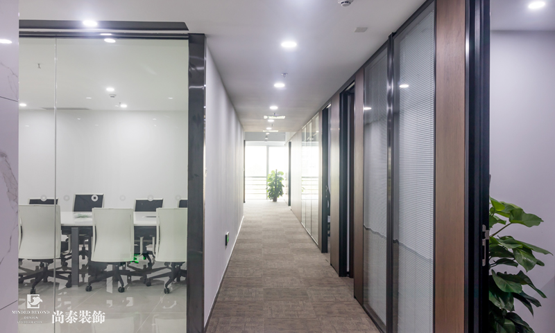 走廊裝修實(shí)拍圖,左右兩邊分別是會(huì)議室,辦公區(qū),明亮的燈光,地面也采用地毯,也到達(dá)防滑的效果,遠(yuǎn)處的綠植達(dá)到引領(lǐng)的裝飾作用。