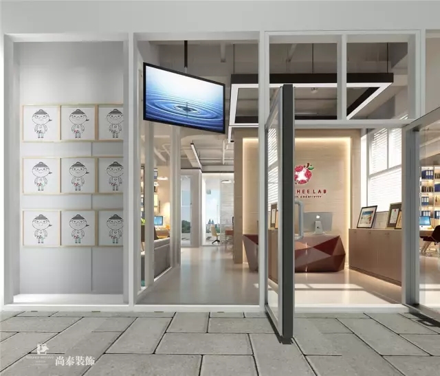 步入前廳接待區(qū),簡潔清晰的前臺(tái)造型和右側(cè)的展示柜一下子吸引了人們的眼球,伴著天花板上面燈具照明的效果,該區(qū)域增加了一種開放的氛圍和現(xiàn)代的感覺,使人達(dá)成對(duì)于創(chuàng)客品牌有效的視覺溝通和傳播。