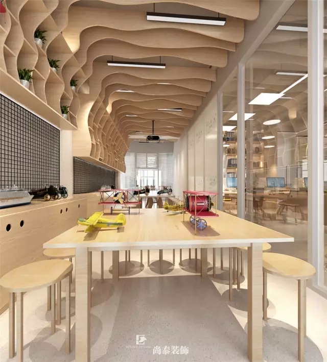 課室的設(shè)計(jì)重點(diǎn)是讓青少年們最大程度地進(jìn)行頭腦風(fēng)暴,發(fā)揮創(chuàng)意。區(qū)別于傳統(tǒng)的設(shè)計(jì)讓這里形成了一道不俗的風(fēng)景,定制的木柜&吊頂滿足了多種功能需求,體現(xiàn)了設(shè)計(jì)審美與功能實(shí)用的雙重結(jié)合。
