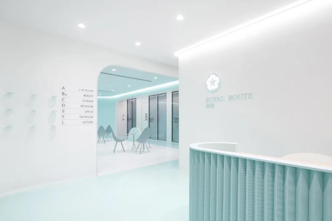 藍綠色是平時多見用于餐飲空間和商業(yè)空間中,用在辦公空間里還是很少見的,但是真的絕??!項目業(yè)主是一家主營皮膚管理的生物科技公司,設計以特制的藍綠色搭配白色奠定了空間的主色調,前廳采用白色和燈帶暈染浪漫唯美的氛圍,突出藍綠色格柵的接待臺。內部空間則大部分采用了淺淡的藍綠色,被這樣溫柔清新的空間包圍著,感覺自己煩躁的心情會立馬就變得平靜了。