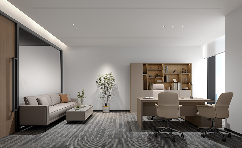 窗邊換透光紗簾,最大化引入自然光;背光區(qū)、拐角處加落地?zé)?、磁吸柔光射燈,用柔和的漫光填補暗沉死角;避免單一強(qiáng)光直射,明暗層次搭配,整個辦公室亮而不眩,通透又舒服。